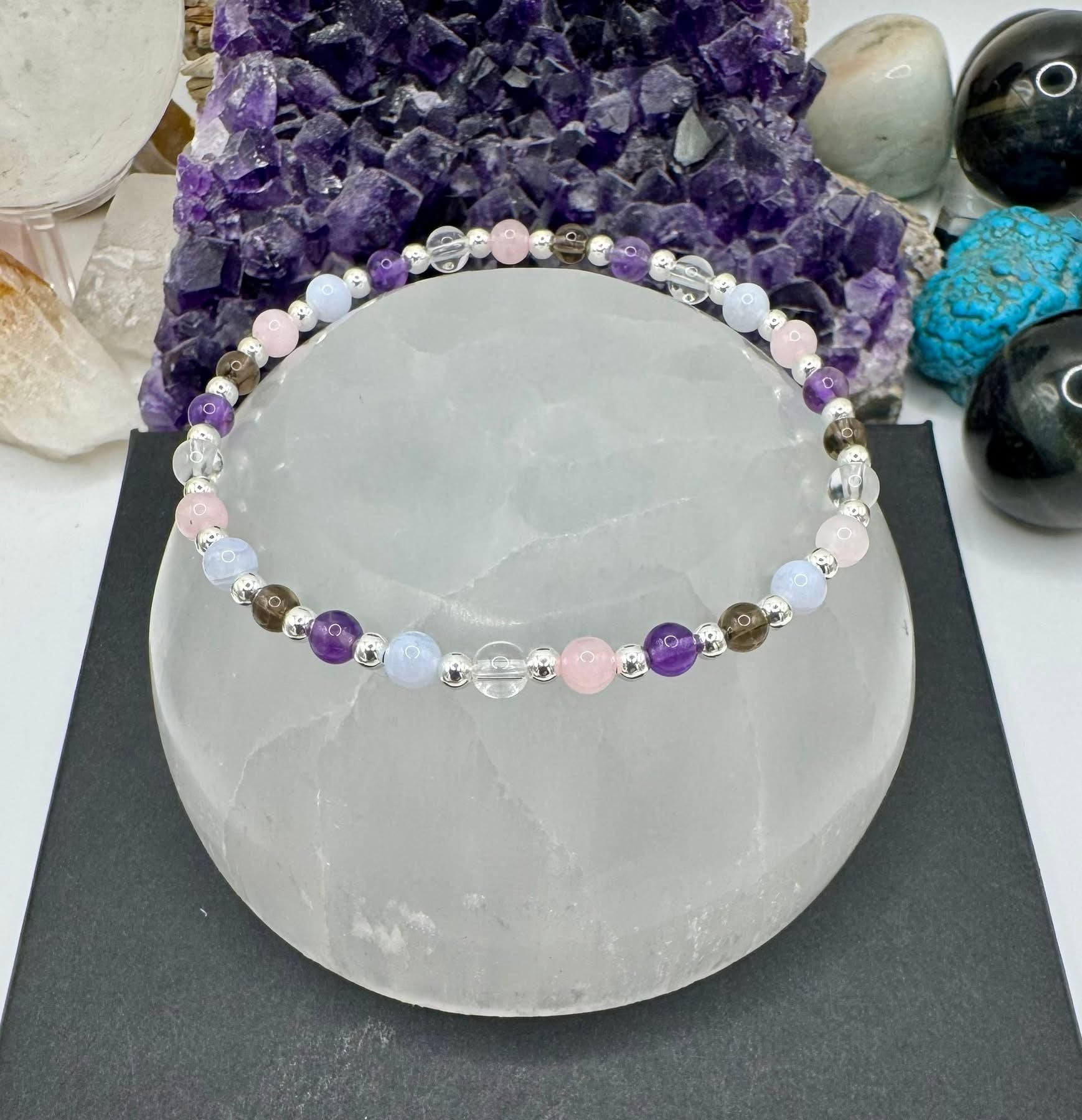 Made with 6 different gemstones to help with anxiety… Amethyst, Rose Quartz, Clear Quartz, Smokey Quartz, and Blue Lace Agate