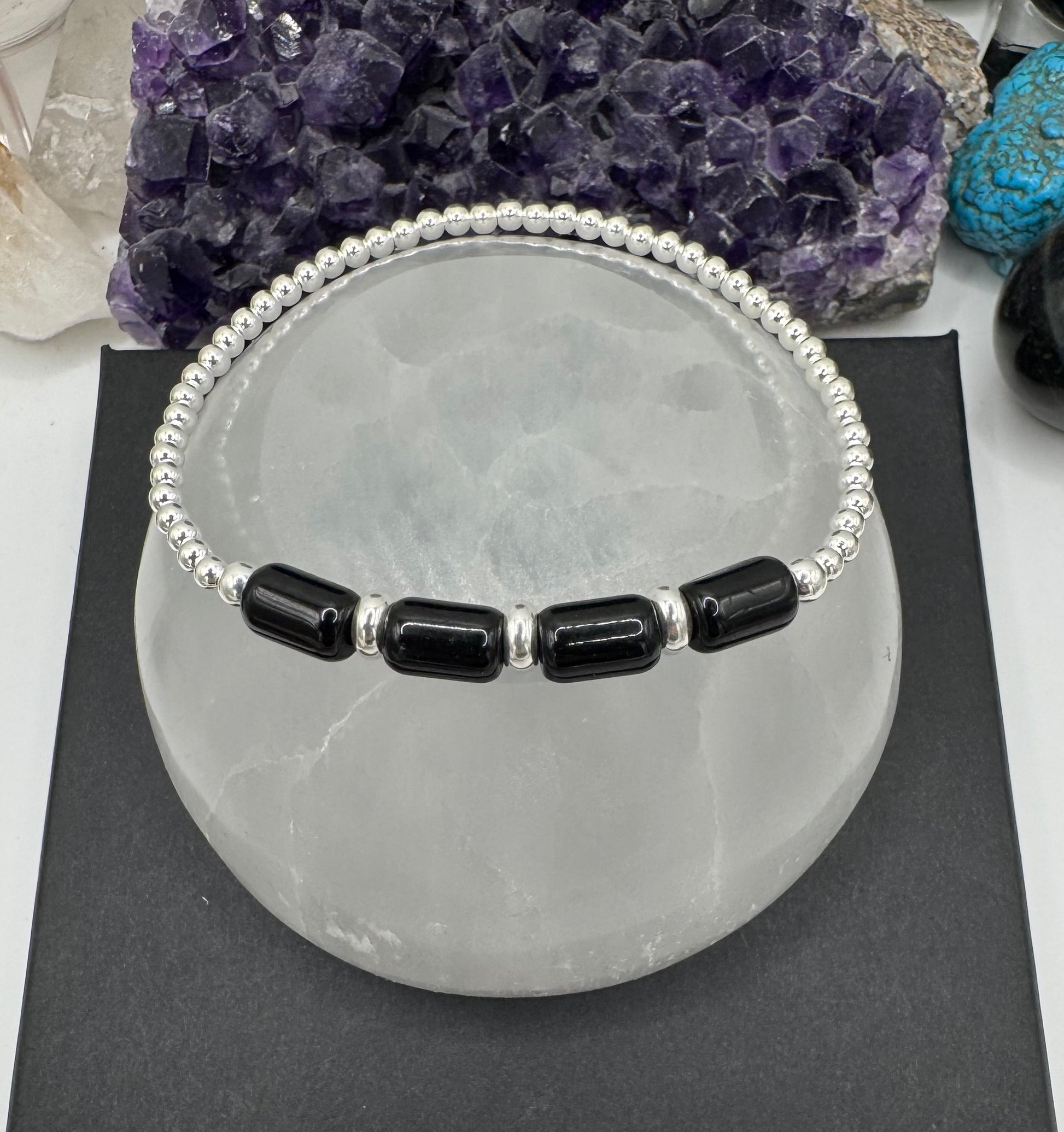 ✨These bracelets have been made with Black Tourmaline barrel beads, and .925 sterling silver round and ring beads Â