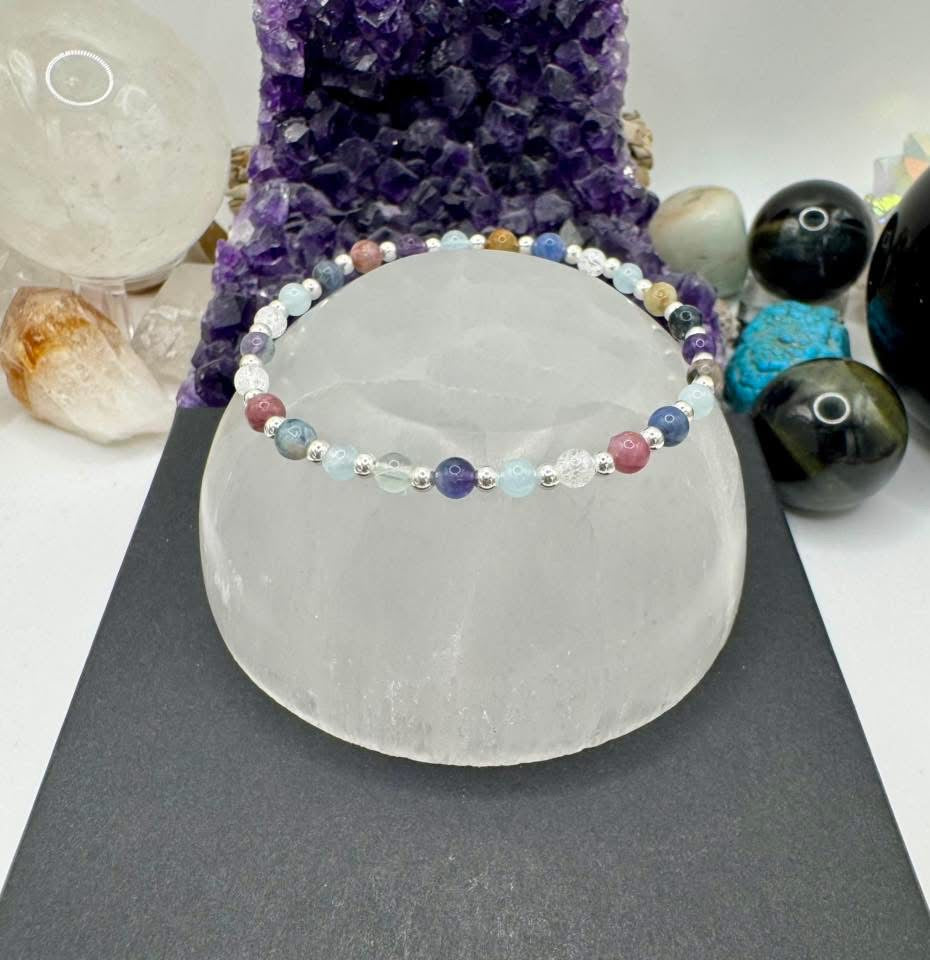 Made with 5 different gemstones boost confidence… Mixed colour Tourmaline, Fluorite, Aquamarine, Sodalite, and Crackled Clear Quartz