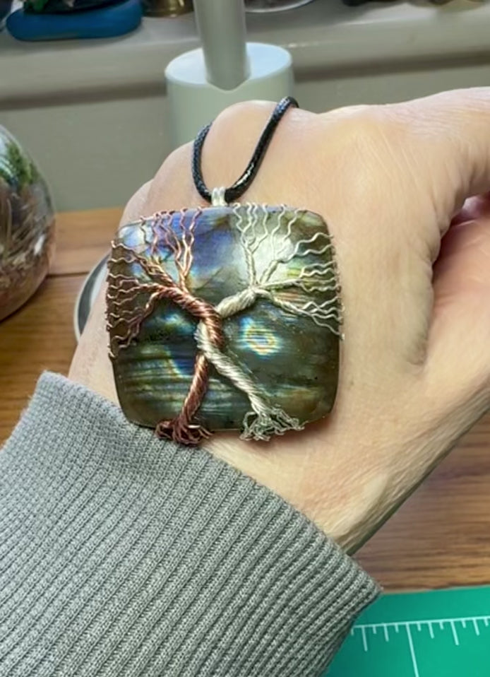 ✨This gorgeous Labradorite with ‘oil slick’ colour flashes, has been wrapped in Copper and sterling silver filled wires in a double tree design.