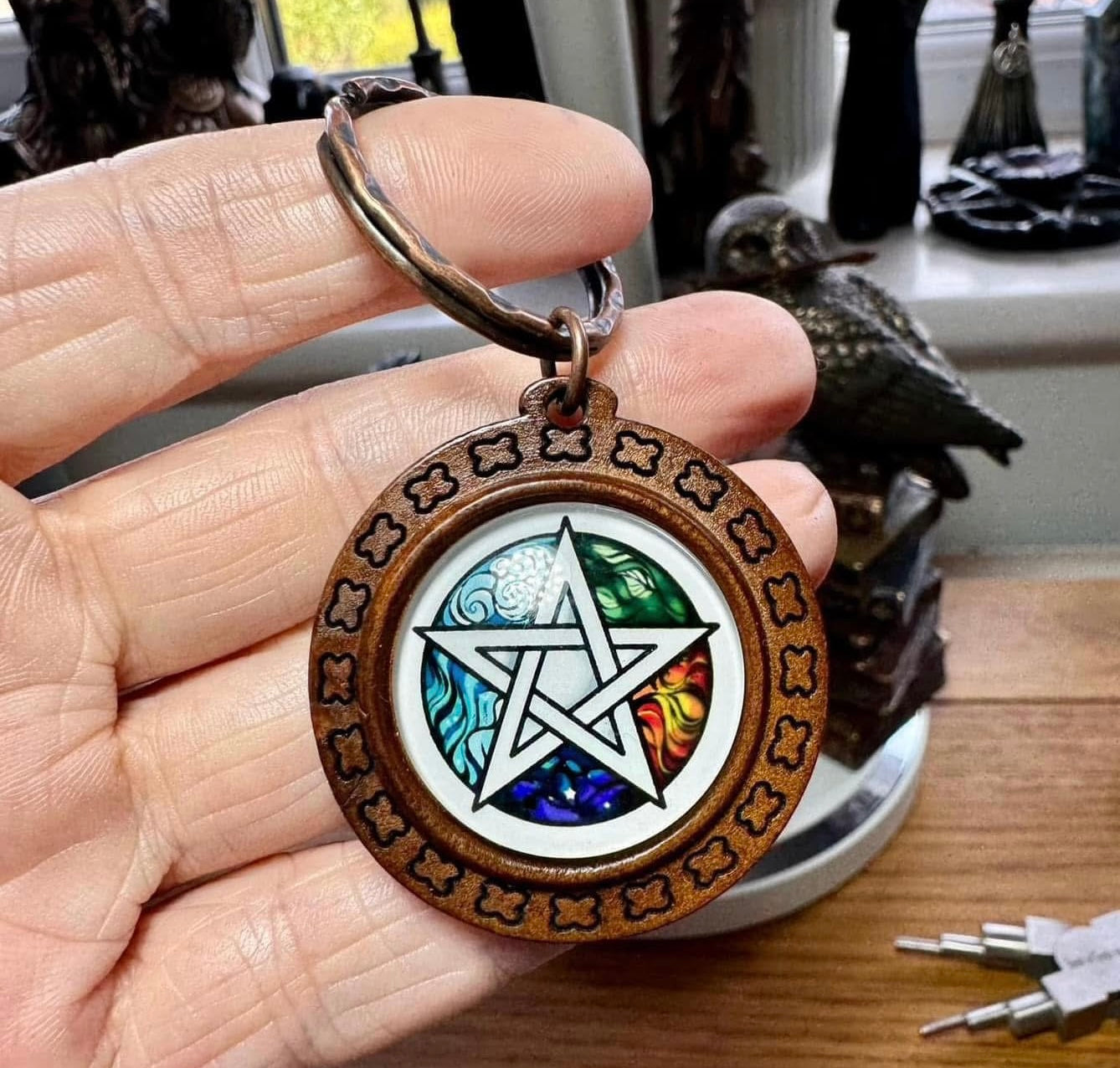 These wooden keyrings measure 39mm and have a resin pentagram centre.