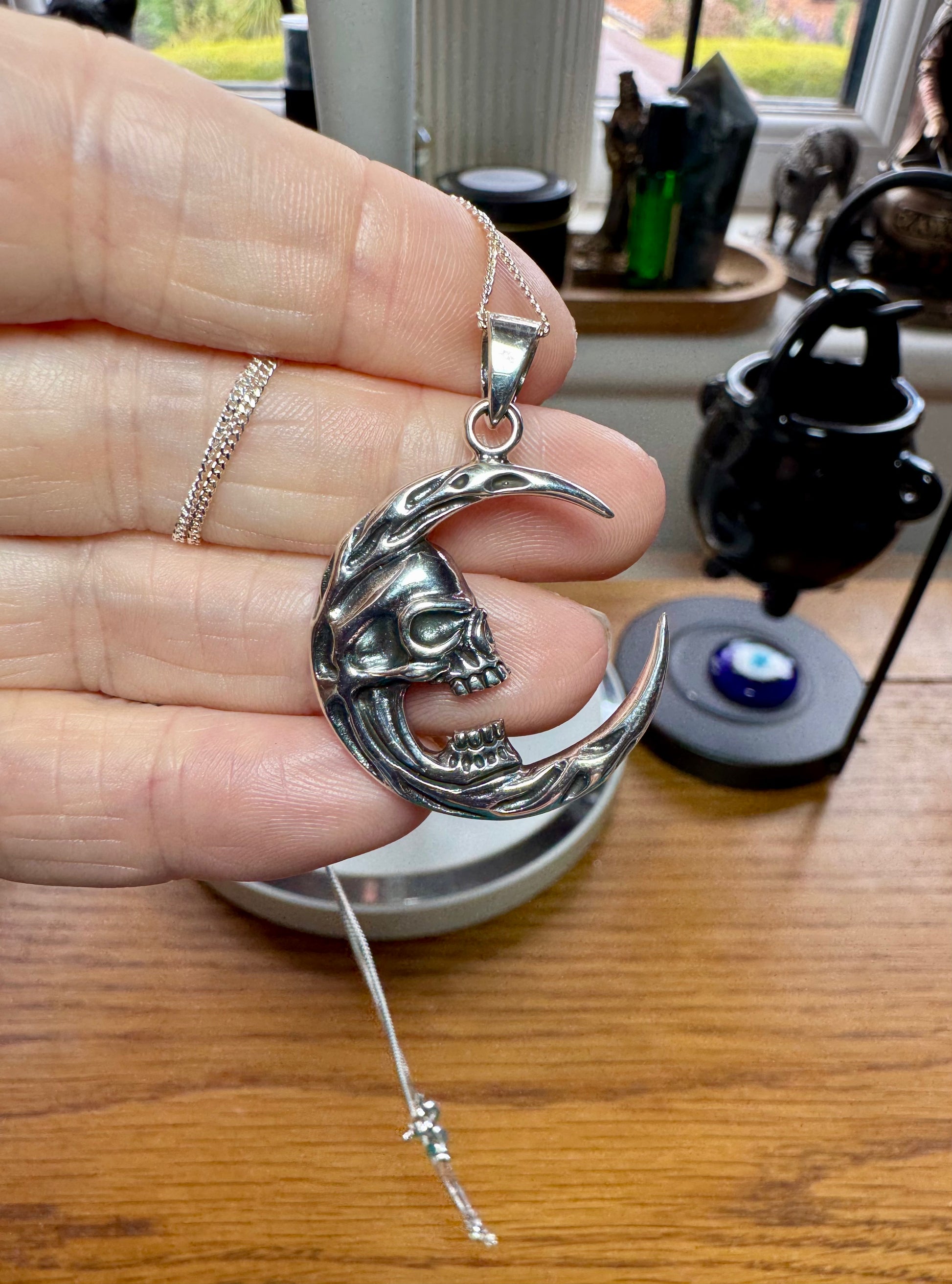 ✨This really unique Moon and skull pendant is sterling silver and measures 36 x 27mm, including the bail.