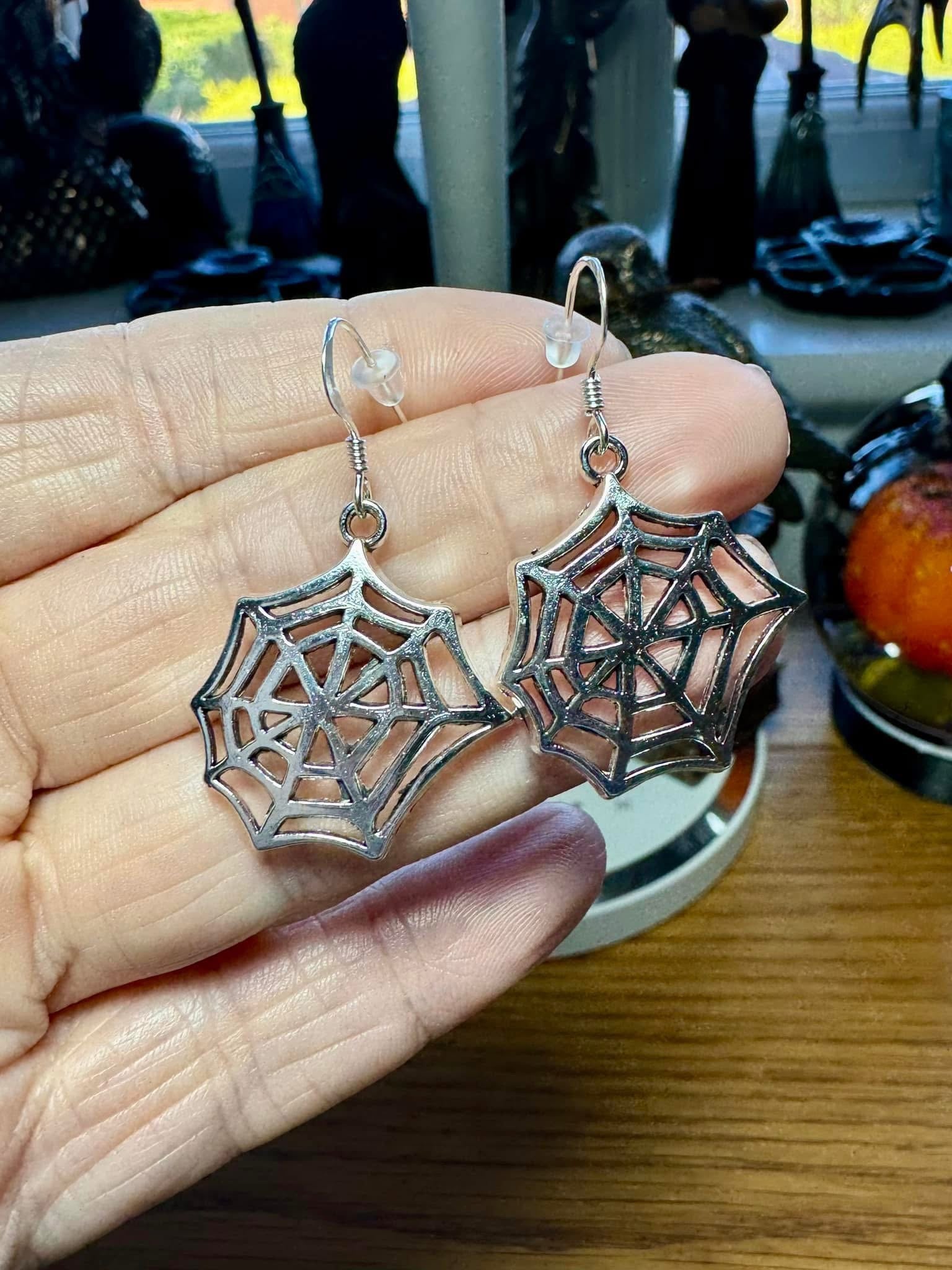 Metal alloy spiders webs with Sterling Silver shepherds hooks and silicone stoppers.