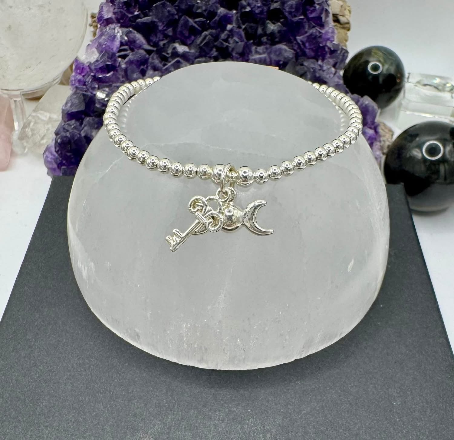 Hekate key and triple moon beaded Bracelet. .925 sterling silver.