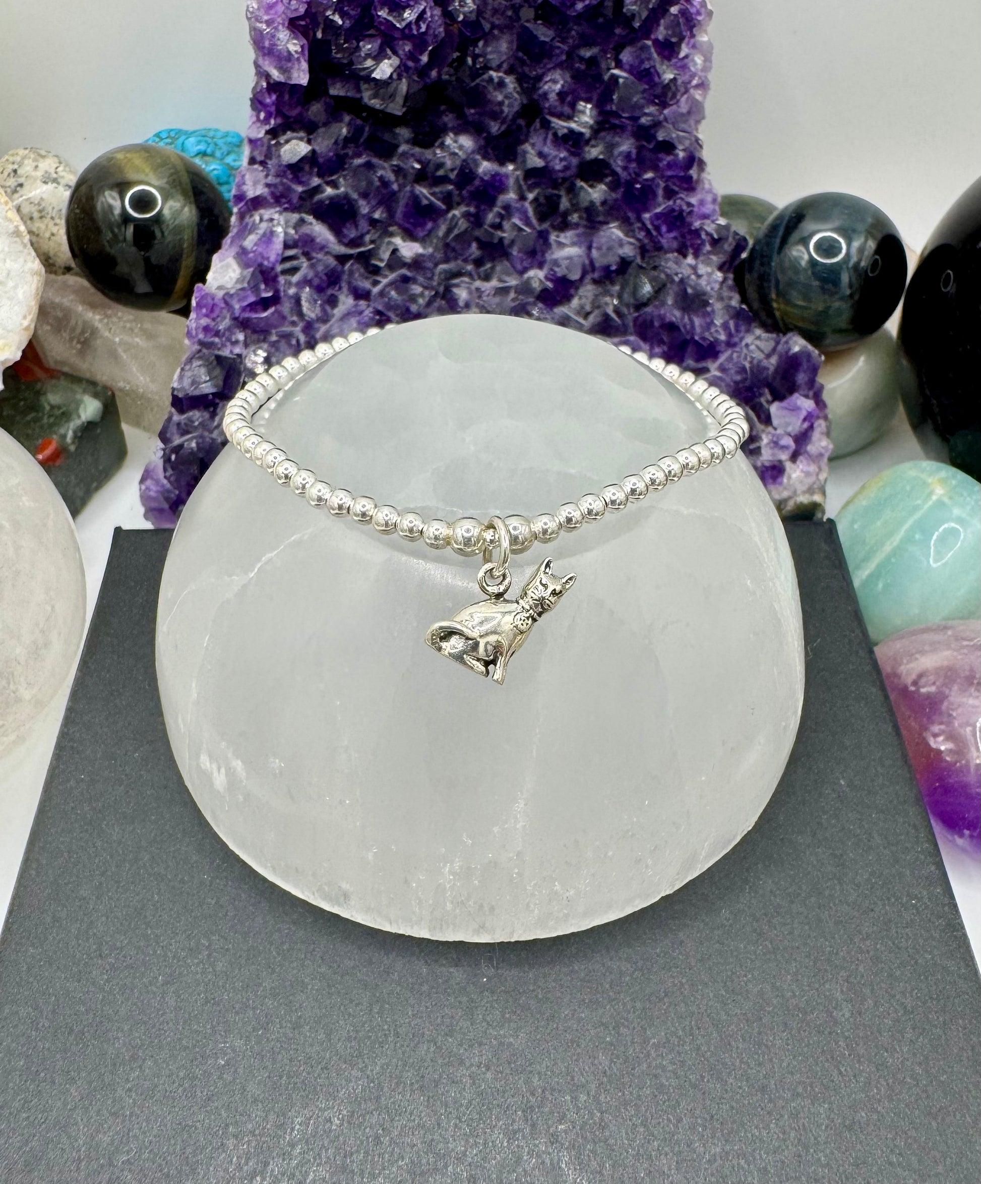 Witches Cat with pentacle collar beaded Bracelet. .925 sterling silver.