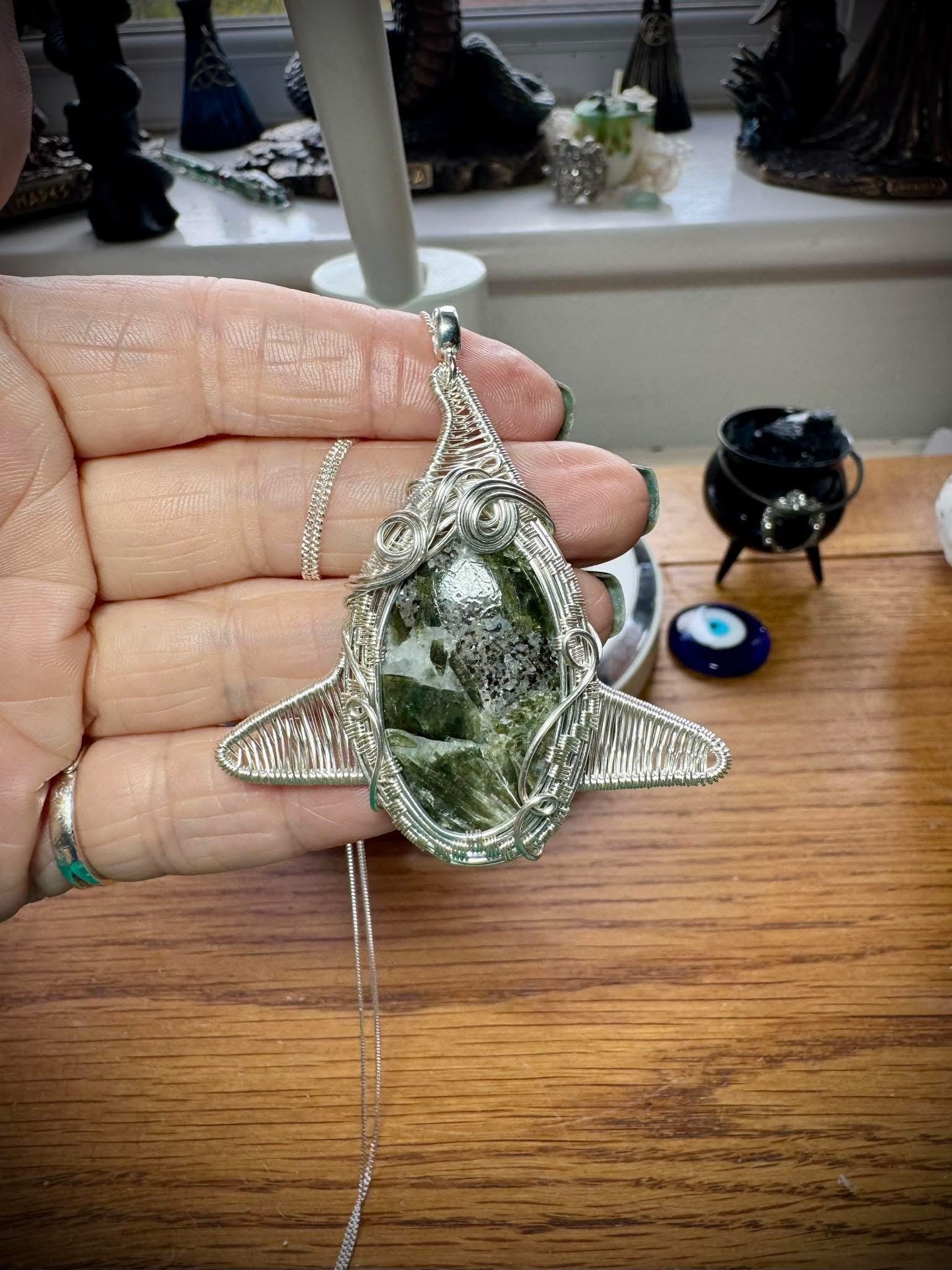 ✨This beautiful oval has been wrapped in high quality, and high silver purity, silver filled wire. The background to the pendant is in the shape of a witches hat.